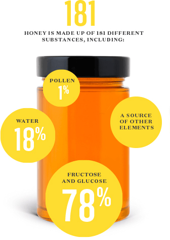There are over 300 varieties of honey in the world. The colour, flavour and thickness are influenced by the floral source. Honey's colour range extends from white and blonde to brown, red and a dark, almost blackish, brown. Its flavour is equally varied. In general, the darker the honey, the more pronounced the flavour.